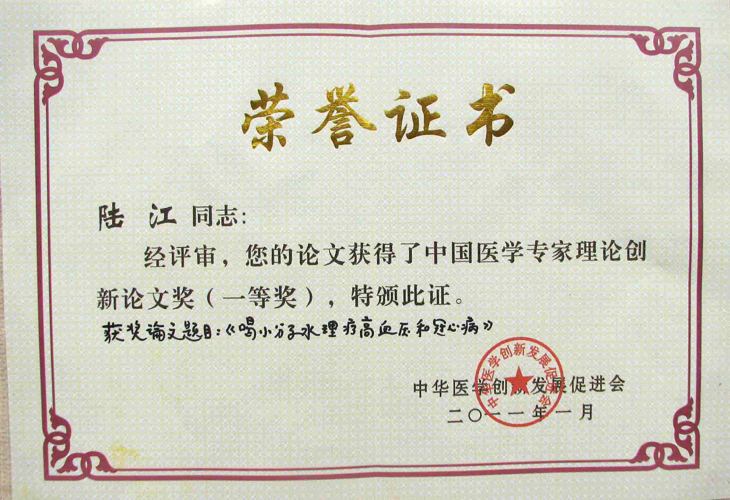 新疆63歲的賀兆生飲用一年,冠心病未愈,他用電話介紹是食堂管理員,問他食量多少?說吃七八分飽,睡前還吃兩袋牛奶,陸 江說我在論文和書中多次批判“吃七八分飽”,關(guān)照患者務(wù)必用“己饑方食”控制主食肉食量,要他把牛奶改在早中餐吃,減少主食肉食量,建議不吃晩餐,晚上只吃一個蘋果,再經(jīng)幾個月補水節(jié)食,治愈了21年的冠心病和肥胖、失眠等病,信中由衷地感激陸 江為再生父母。[13]因為醫(yī)生從未過問他的膳食習慣,只管開處方藥或手術(shù),父母也不會叫他不吃晩飯。