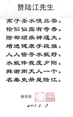 凡尊重中國古代養(yǎng)生智慧的患者,堅持“已饑方食”和定時主動補水者,均可祛病康復(fù)。如牡丹江醫(yī)學院87歲的張鵬圖飲用半年后高血壓未痊愈,陸江與他通話交流,了解他原先每日主食4兩,建議他用“已饑方食”減少主食肉食量,他理解后,將每日主食減為3兩,少吃兩塊肉,飲用一年治愈26年的冠心病和高血壓。他2003年5月31日來信說:“飲用卓康小分子團水是根治高血壓、冠心病、糖尿病的一把金鑰匙,是填補醫(yī)學空白,為人類造福,應(yīng)推廣該產(chǎn)品?!?/strong>