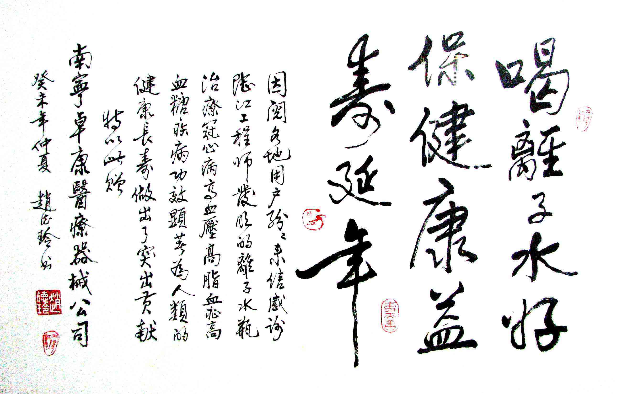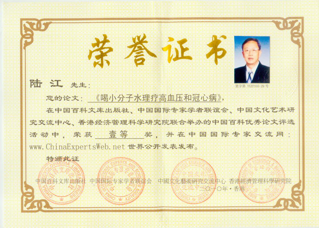-----我是從事建筑的高工,本來沒有資格去攻克醫(yī)學難題,卻為了自身健康才扣響醫(yī)學的大門。由于我1990年患高血壓,因怕中風才研究發(fā)明了離子水瓶,我把水處理成微小分子團水,飲用后治愈了高血壓。便于1993年底送到三家省級醫(yī)院做臨床試用4個月。經(jīng)北京和廣西醫(yī)學專家鑒定:"降脂降壓效果好"," 能擴大心腦動脈流量,改善心腦電圖以及微循環(huán)","對治療心腦動脈粥樣硬化、高血壓、高血脂有良好的醫(yī)療保健作用。""產(chǎn)品的技術(shù)性能和療效達到了同類產(chǎn)品的國內(nèi)領(lǐng)先水平,經(jīng)廣西醫(yī)學科學情報研究所檢索,未見國外有類似報道。"中國醫(yī)學科學院張正國教授從美國國立醫(yī)學圖書館數(shù)據(jù)庫存Medline檢索英俄文資料,均未見類似報告。2000年上市后,我為了對消費者負責而繼續(xù)觀察研究,一直通過《信譽卡》和《質(zhì)量跟蹤調(diào)查書》向患者承諾療效,請用戶使用6個月后反饋效果。和脂壓患者飲用2至5個月內(nèi),消除癥狀,停服藥物,血壓正常;冠心病患者飲用3~5個月逐漸減輕至消除心絞痛、房顫等癥狀,不再服藥,飲用1年左右心電圖正常,經(jīng)冠脈造影掃描無明顯狹窄,表明冠心病痊愈。大量患者還反映許多衰弱器官被修復(fù),讓前列腺增生、慢性咽喉炎、慢性氣管炎、支氣管炎、慢性胃炎、腸炎和膽囊炎等不藥而愈;2型糖尿病患者是因為胰島衰弱致病,飲用該水半年至一年,逐漸減藥至停藥,血糖尿糖正常,真正治愈2型糖尿病。中風后遺癥患者飲用六七個月,可逐漸減輕至消除肢體和語言障礙,表明飲用該水能讓壽命很長的神經(jīng)元細胞逐漸修復(fù),奇跡般地恢復(fù)肢體和語言功能。飲用后還使胸腺和脾臟兩個重要的免疫器官被修復(fù)和增強,產(chǎn)生免疫細胞多,提高了免疫力,使人不生病或少生病。自此, 飲用微小分子團水創(chuàng)造了攻克冠心病、高(低)血壓和糖尿病三大醫(yī)學難題的奇跡。人們對此感到不可思議,但實踐是檢驗真理的唯一標準。