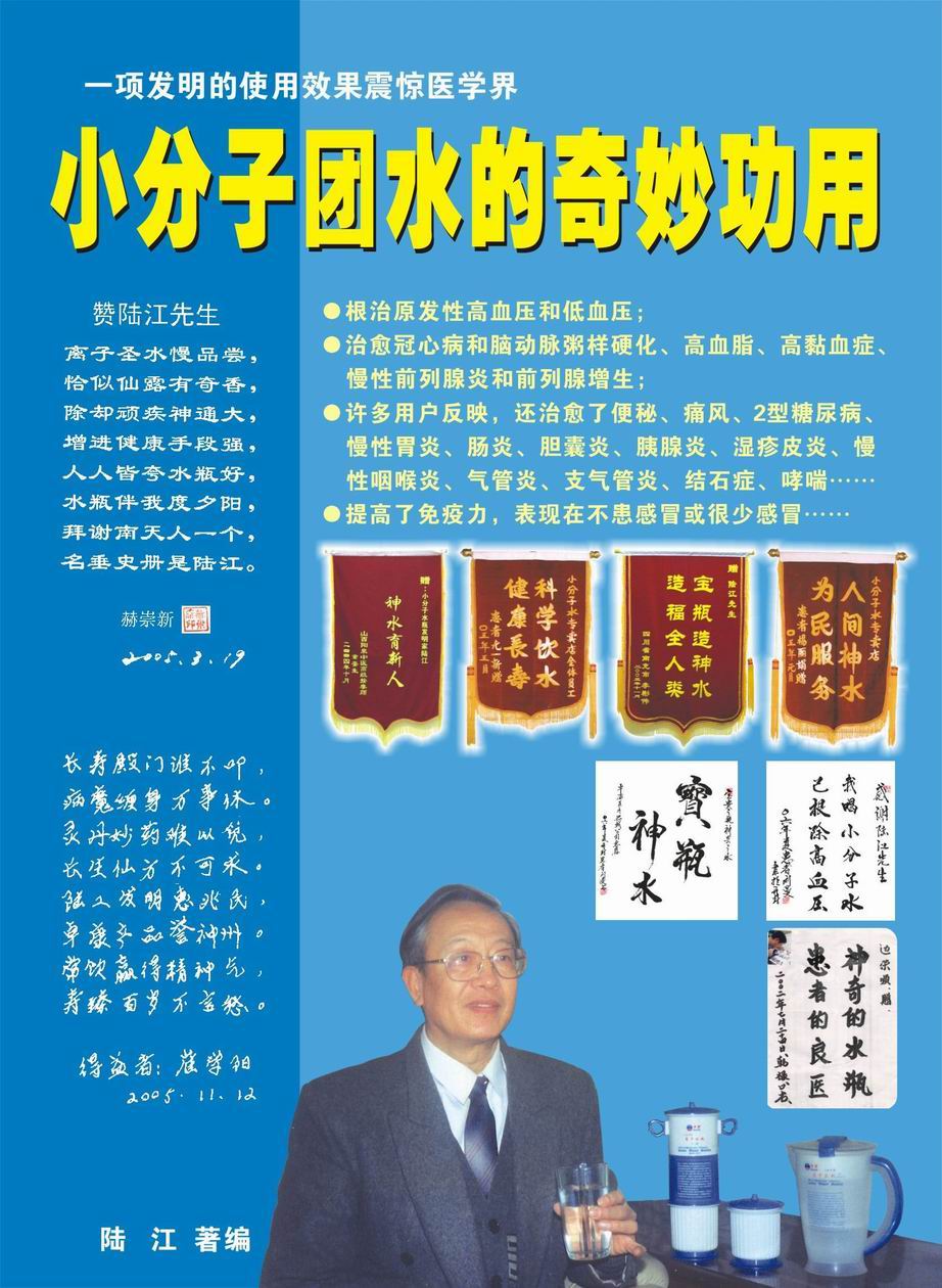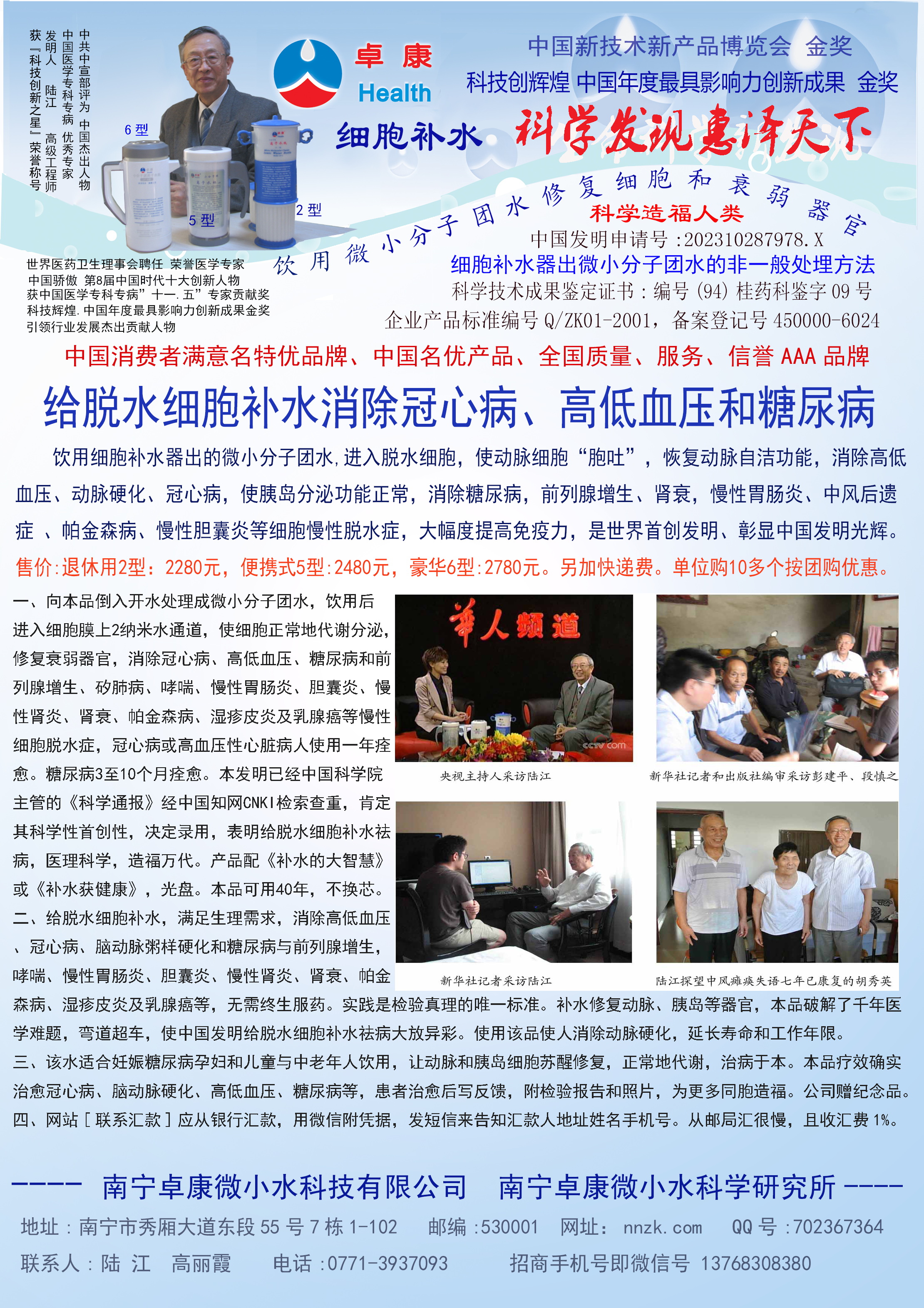 人類幾千年來患以上病癥需終生服藥,幾十年也不能治愈??墒俏覈蠈幍母呒壒こ處熽?nbsp;江,于1990年想根治高血壓,研究發(fā)明了離子水瓶,處理出微小分子團水供飲用,經(jīng)過醫(yī)院臨床試用和專家鑒定,1999年獲中國發(fā)明專利權(quán),產(chǎn)品于2000年投放市場后一直跟蹤調(diào)查,據(jù)全國各地用戶反饋:祛除了高低血壓、糖尿病和冠心病,并使前列腺增生、咽喉炎、鼻竇炎、慢性氣管炎、支氣管炎、矽肺病、哮喘、慢性胃炎、腸炎、慢性膽囊炎、慢性腎炎、腎衰、膀胱炎、便秘、痔瘡、風濕性關(guān)節(jié)炎和濕疹皮炎及中風后遺癥等病癥不藥而愈。為什么喝微小水能治20多種病?陸 江從1991年德國科學家發(fā)現(xiàn)細胞膜水通道僅為2納米獲得啟發(fā),認為多種器官患病是因細胞脫水,不能正常代謝和分裂增殖,才使器官細胞減少致衰弱萎縮而形成細胞缺水性病癥。22年來的實踐有力地支持了“細胞脫水致病”這一重要論點,表明喝微小水可滿足細胞的生理需求,補水就能祛病,是生命科學新亮點。